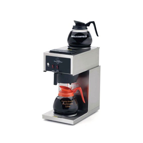 Bloomfield Koffee King Pour Over Coffee Decanter Brewer w/ 2 WarmersThis Lo-Profile Brewer would be an excellent choice for your coffee service needs. At just under 17" tall this brewer is compact and would work well if your counter space is limited. Premium quality thermostat has a full-length stainless steel sensing bulb that recognizeswater temperature accurately and cycles less frequently. High-quality, easy-to-clean stainless steel construction. Ready-to-Brew light indicates the proper water temperature to help eliminate the guesswork in brewing. Porcelain enameled warmer plates position decanters securely and, with no exposedscrewheads, will not scratch or scrape decanters. Model #: 8543 581045