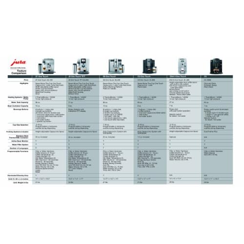 Equipped with One Touch technology, this automatic coffee-and-espresso center makes cappuccino, cafe mocha, latte, or latte macchiato with the simple touch of a button, without having to move the cup. In just a matter of seconds, it grinds, tamps, and brews one or two cups at a time, 1/2 to 16 ounces. The countertop appliance comes equipped with an insulated stainless-steel 20-ounce milk container, which stays right next to the machine and keeps cold milk cold for up to eight hours. It also provides a commercial-grade sound-insulated conical burr grinder with a 10-ounce bean container and six fineness settings for any type of bean--from light to dark roasts, while a separate funnel for pre-ground coffee allows for making decaf or flavored coffee drinks. In addition to its 18-bar pump, the unit features two, independent, stainless-steel-lined ThermoBlock heating systems for coffee preparation and steam production with no wait time in between, plus four beverage buttons that can be individually programmed for cup size, strength, and temperature--simply turn and push the rotary switch to make the selection. Use the "a la carte" button for customizing the cup size and strength just before brewing, or choose from three hot-water temperature settings for Cafe Americano or a variety of teas including green, herb, and fruit teas. Other useful details include a graphic display that indicates the brewing or maintenance process, an illuminated coffee-brewing area, a stainless-steel cup-warming platform, a height-adjustable coffee spout, and electronic sensors that indicate when more coffee beans need to be added, as well as a large 96-ounce water tank, a Clearyl water-care system that eliminates the need for decalcification, automatic cleaning cycles, and three Energy Saving modes. Accessories include a Clearyl water filter, cleaning tablets, a measuring scoop, a water-hardness indicator strip, and a DVD with detailed tips on brewing, frothing methods, and cleaning. UL listed for household use, the 1250-watt coffee-and-espresso center measures 15 by 13-1/2 by 14-3/4 inches and carries a limited warranty for two years or 6,000 cups, whichever comes first. From the Manufacturer The Impressa S9: Serving Coffee Perfection Coffee perfection is just one touch away with the Jura-Capresso Impressa S9 One Touch automatic coffee center. Become your own barista by creating authentic cappuccino and latte at the touch of a button, without even having to move the cup. This top-of-the-line automatic coffee center is the first and only with a one-touch Latte Macchiato button and with a programmed pause to create its distinctive layers of frothed milk, espresso, and steamed milk. Jura-Capresso is the first and only company with a line of one-touch automatic coffee centers with insulated milk containers to keep milk cold for up to eight hours for frothing and steaming. The Impressa S9 One Touch comes with a 20-ounce stainless steel insulated milk container and two ways to steam or froth milk: the Dual Frother and Jura-Capresso's exclusive frothXpress Plus system for automatic frothing and steaming into the cup. The Impressa S9 One Touch also stands out for having two thermoblock systems for fast and powerful performance, with no downtime between brewing and frothing. This new automatic coffee center becomes the flagship model for Jura-Capresso's premier S-line, offering a true bean-to-cup experience with professional-quality high-pressure-brewed coffee beverages with just one touch, from cafe-quality crema coffee and espresso to a world of espresso-based drinks. It also dispenses hot water for tea and creates foamy hot chocolate from chocolate milk Programmable and Powerful The fully programmable Impressa S9 One Touch lets you program the machine for cup size, cup strength, temperature and more, to ensure that your beverage is brewed to your specifications. It can even be programmed differently for each day of the week. Programming is easy, as is overriding the programming to personalize your brew at any time. The A La Carte button let you create your own special brew. Choose your brew by turning the rotary dial, then press the one-touch beverage button and the machine froths or steams milk, grinds, tamps, brews and then self cleans in less than 60 seconds. Energy-Saving and Feature-Packed Energy-saving functions include a main power switch that ensures zero energy is pulled when the machine is off but still plugged in. Programmable energy saving options allow the machine to draw less energy in stand-by mode. A stainless steel warming plate on top of the machine warms cups before brewing. Featuring sensor technology, it reminds you when beans need to be refilled. An illuminated brewing area adds to its visual appeal. The Impressa S9 One Touch is extremely user friendly and controls are easy to read. The 2-line alpha-numeric display includes helpful graphics and subtle acoustical alerts that make the machine intuitive to use. The Impressa S9 One Touch comes with a 10-ounce bean container, a large 96-ounce water tank and a Clearyl Water Filter to remove impurities and improve taste. Specifications Programmable for coffee strength, cup size, and more frothXpress Plus system automatically froths or steams milk 14-ounce stainless steel insulated milk container Height-adjustable coffee spout Electronic sensors that indicate when more coffee beans need to be added 96-ounce water tank 8-ounce bean container Chrome-plated cup storage area Adjustable conical burr grinder with six fineness settings Separate funnel for pre-ground coffee CLEARYL water filter Includes a DVD with detailed tips on brewing, frothing methods, and cleaning UL listed for household use 1250-watts Measures 15 by 13-1/2 by 14-3/4 inches Limited warranty for two years or 6,000 cups, whichever comes first